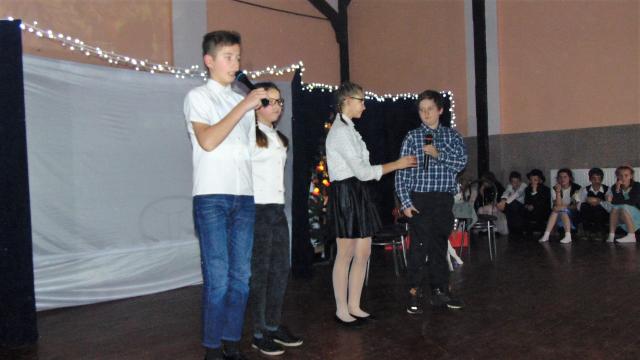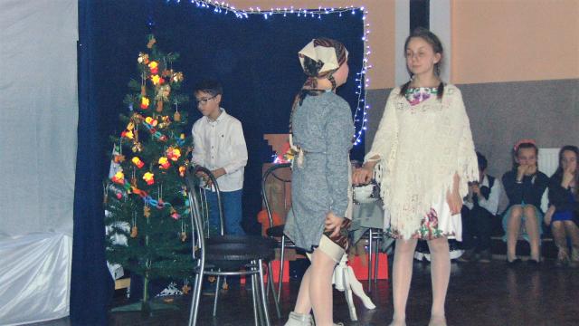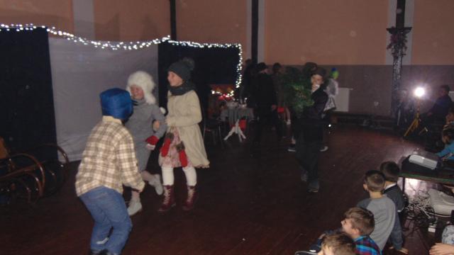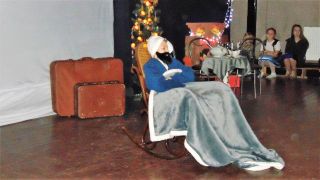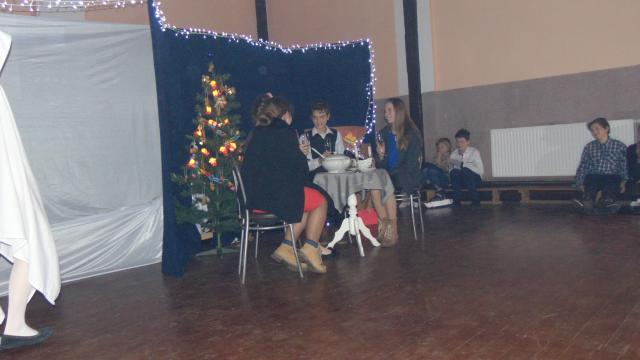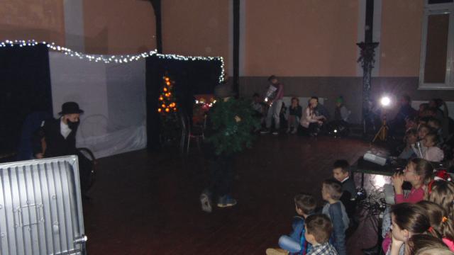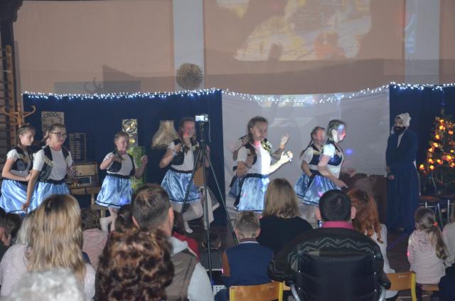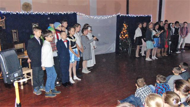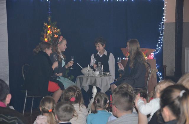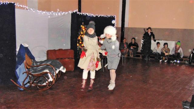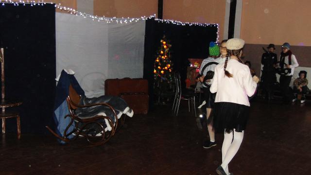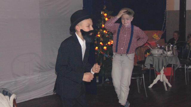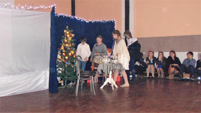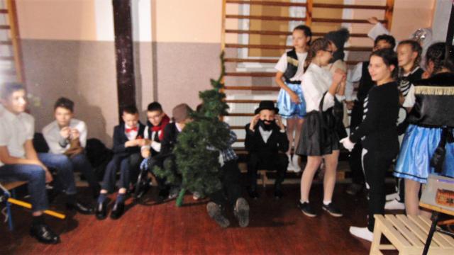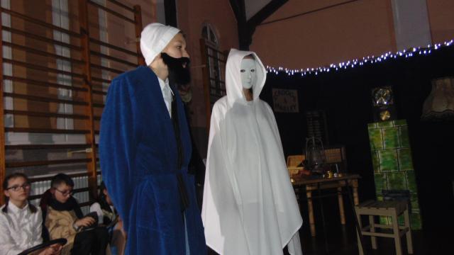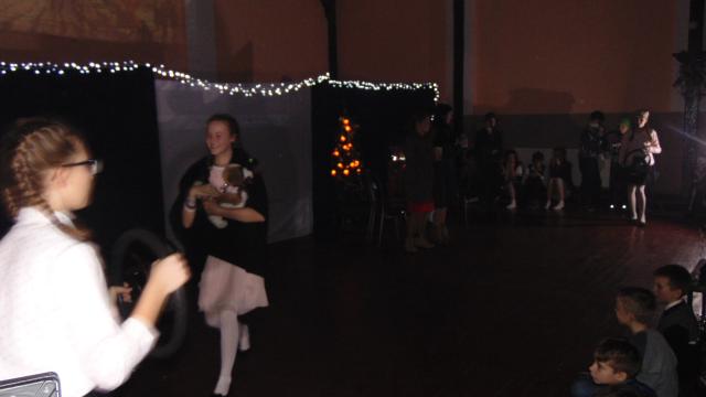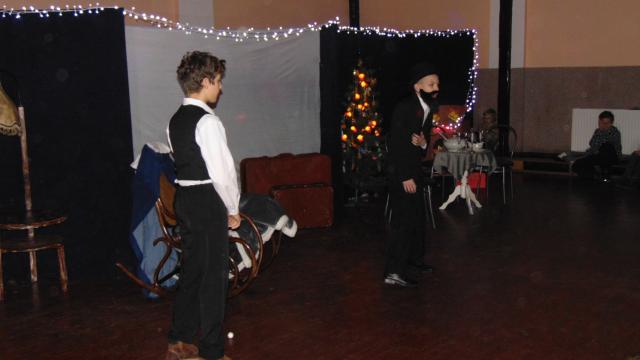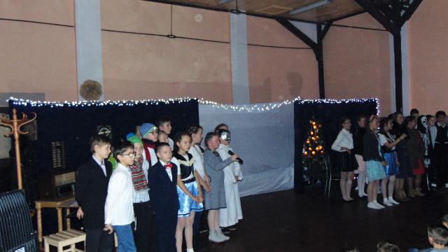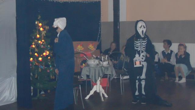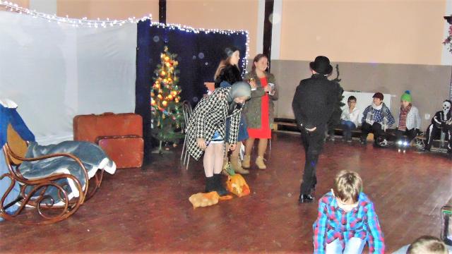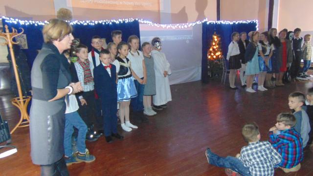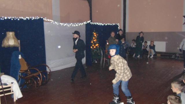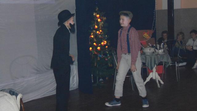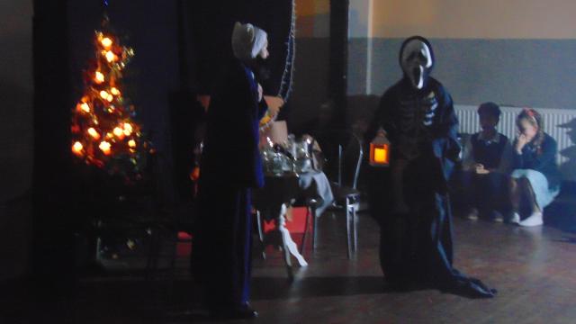 Na tegoroczne spotkanie świąteczne, które odbyło się popołudniem 20 grudnia w sali wiejskiej Nowej Wsi Ujskiej, uczniowie klas V-VII pod kierunkiem wychowawców przygotowali sceniczną adaptację tekstu K. Dickensa pt. „Opowieść wigilijna”. Było to przedsięwzięcie o tyle trudne, że prezentowane w tekście zdarzenia rozgrywają się w trzech wymiarach czasowych (w przeszłości, teraźniejszości i przyszłości ). Postanowiliśmy więc wykorzystać różnorodne formy przekazu ( m.in. film, animację, taniec czy teatr cieni ), aby oddzielić od siebie te różne perspektywy. W nastrój świątecznej, pełnej zabieganych ludzi ulicy przeniosła nas muzyka filmowa - „Amerykanin w Paryżu” G. Gershwina. Ktoś dźwigał ciężkie prezenty, inny niósł choinkę, dzieci rzucały się śnieżkami i jeździły na łyżwach, a obok mijały nas z głośnym dźwiękiem klaksonu auta. Nie zabrakło w tej świątecznej zawierusze Ebenezera Scrooge’a ( doskonały w swojej roli Marcin Karabasz ), który świąt nie uznawał i nie obchodził ich. Przybycie w nocy zjawy dawnego wspólnika – Marleya ( Maksymilian Szczęsny) i zapowiedź kolejnych odwiedzin 3 duchów miało wszystko zmienić. Formę dramy wzbogaciliśmy animacjami oraz mrocznym tańcem szkieletorów ( do utworu M. Musorgskiego „Baba Yaga” ) które zapowiadały przybycie nieproszonych gości – duchów ( Duch I – Mikołaj Ilczuk ). Czas przeszły doskonale oddały utrzymane w odcieniu sepii filmy oraz układ taneczny z dzwoneczkami ( „Jingle Bells” ). Nie zabrakło także teatru cieni i dymów, które zwiastowały wizytę Ducha Tegorocznych Świąt Bożego Narodzenia (Julia Jankowska). Pokazał on prawdę o świętach u najbliższych Scrooge’a: siostrzeńca Freda (Igor Wilczura) i pracownika Boba (Mateusz Marchewka). Najmroczniejszym był jednak duch ostatni (Zuzanna Chamarczuk) i mimo, iż nie przemówił ani jednym słowem, zapowiadał rychłą śmierć bohatera, jeśli nie nastąpi jego przemiana. Od tego momentu znamiennej nocy Ebenezer zaczyna swe życie na nowo. I my spinamy klamrą historię bohatera, sięgając po początkową muzykę – „Amerykanina w Paryżu”. Tym razem Scrooge cieszy się i świętami, i życiem, a my wraz z nim!