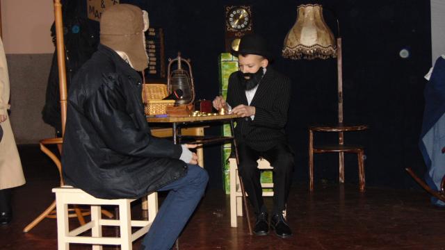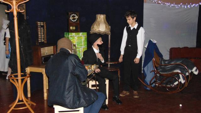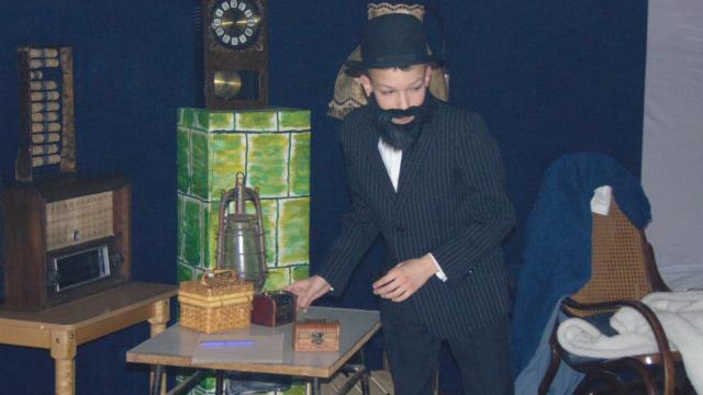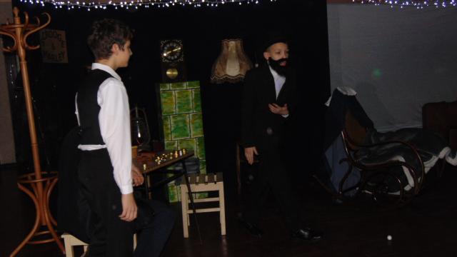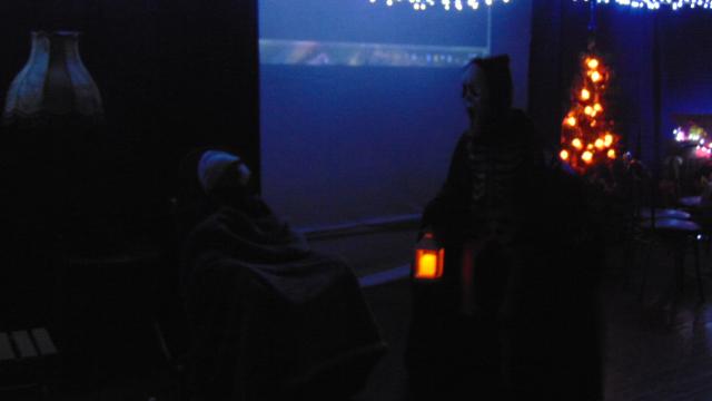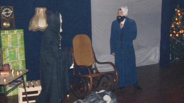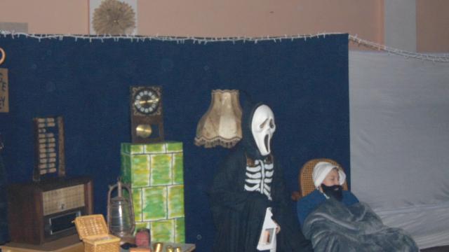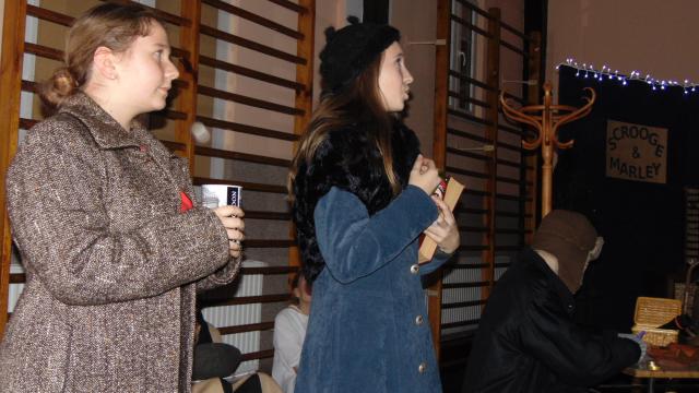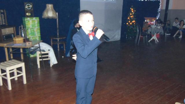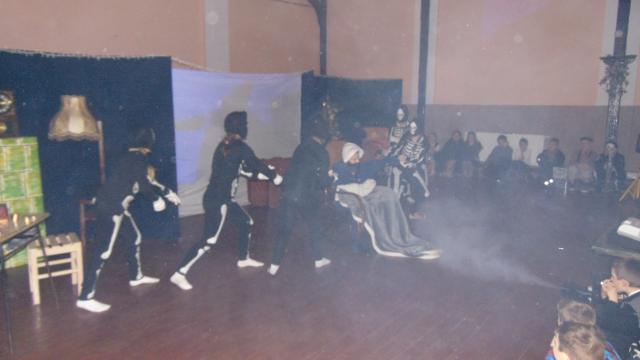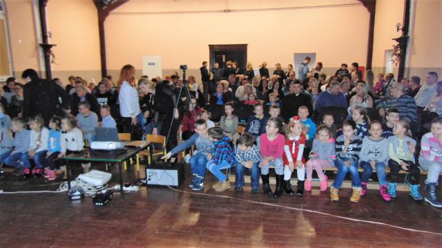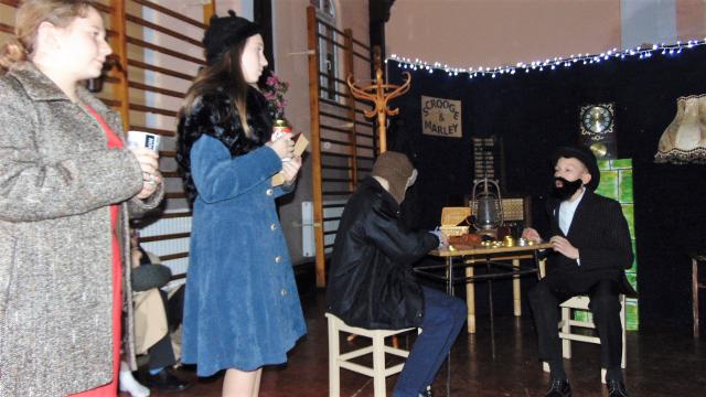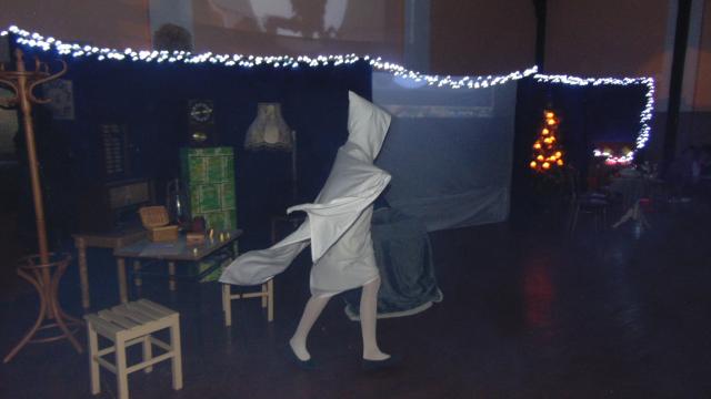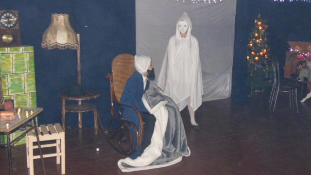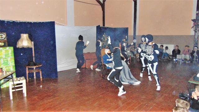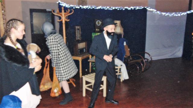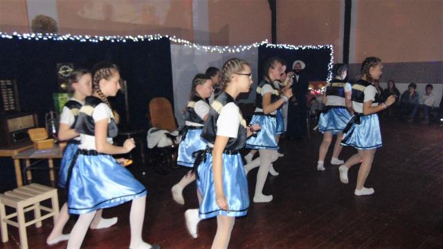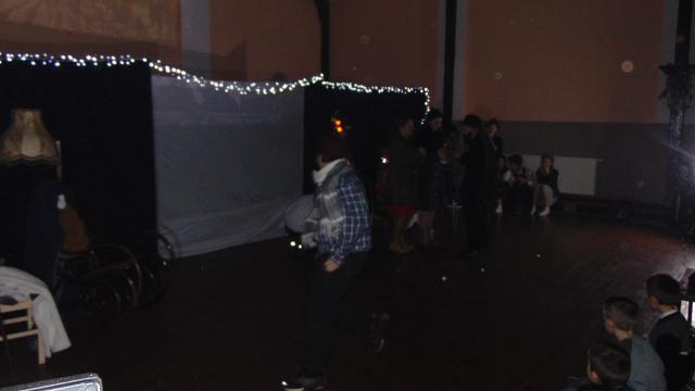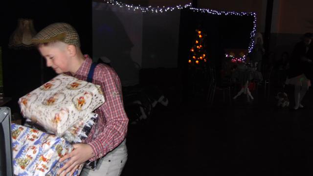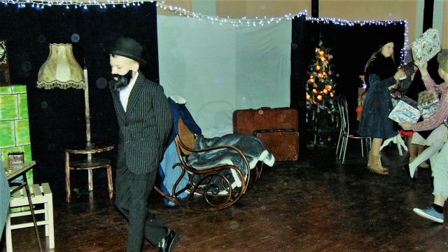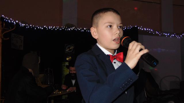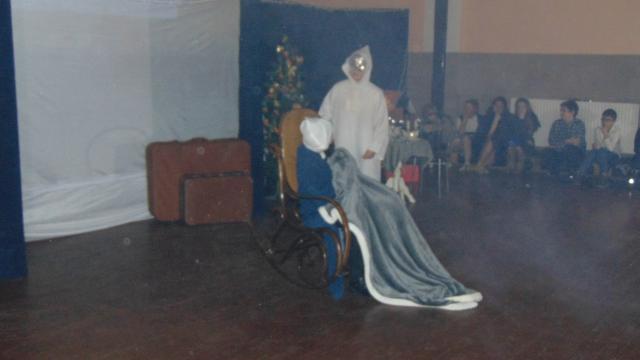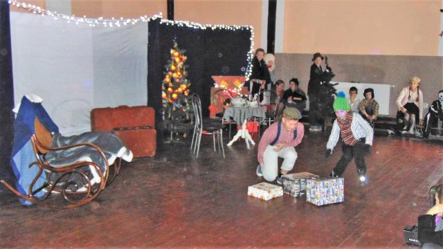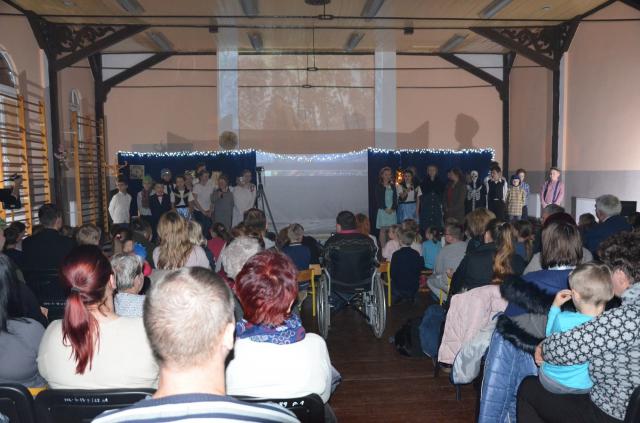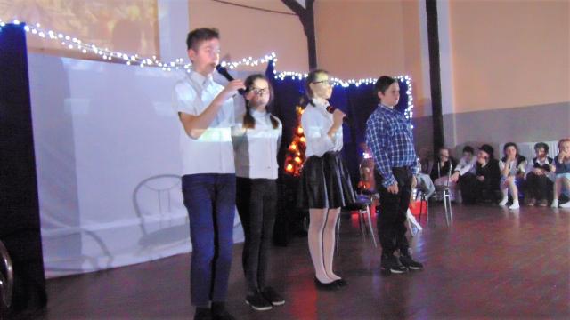Na tegoroczne spotkanie świąteczne, które odbyło się popołudniem 20 grudnia w sali wiejskiej Nowej Wsi Ujskiej, uczniowie klas V-VII pod kierunkiem wychowawców przygotowali sceniczną adaptację tekstu K. Dickensa pt. „Opowieść wigilijna”. Było to przedsięwzięcie o tyle trudne, że prezentowane w tekście zdarzenia rozgrywają się w trzech wymiarach czasowych (w przeszłości, teraźniejszości i przyszłości ). Postanowiliśmy więc wykorzystać różnorodne formy przekazu ( m.in. film, animację, taniec czy teatr cieni ), aby oddzielić od siebie te różne perspektywy. W nastrój świątecznej, pełnej zabieganych ludzi ulicy przeniosła nas muzyka filmowa - „Amerykanin w Paryżu” G. Gershwina. Ktoś dźwigał ciężkie prezenty, inny niósł choinkę, dzieci rzucały się śnieżkami i jeździły na łyżwach, a obok mijały nas z głośnym dźwiękiem klaksonu auta. Nie zabrakło w tej świątecznej zawierusze Ebenezera Scrooge’a ( doskonały w swojej roli Marcin Karabasz ), który świąt nie uznawał i nie obchodził ich. Przybycie w nocy zjawy dawnego wspólnika – Marleya ( Maksymilian Szczęsny) i zapowiedź kolejnych odwiedzin 3 duchów miało wszystko zmienić. Formę dramy wzbogaciliśmy animacjami oraz mrocznym tańcem szkieletorów ( do utworu M. Musorgskiego „Baba Yaga” ) które zapowiadały przybycie nieproszonych gości – duchów ( Duch I – Mikołaj Ilczuk ). Czas przeszły doskonale oddały utrzymane w odcieniu sepii filmy oraz układ taneczny z dzwoneczkami ( „Jingle Bells” ). Nie zabrakło także teatru cieni i dymów, które zwiastowały wizytę Ducha Tegorocznych Świąt Bożego Narodzenia (Julia Jankowska). Pokazał on prawdę o świętach u najbliższych Scrooge’a: siostrzeńca Freda (Igor Wilczura) i pracownika Boba (Mateusz Marchewka). Najmroczniejszym był jednak duch ostatni (Zuzanna Chamarczuk) i mimo, iż nie przemówił ani jednym słowem, zapowiadał rychłą śmierć bohatera, jeśli nie nastąpi jego przemiana. Od tego momentu znamiennej nocy Ebenezer zaczyna swe życie na nowo. I my spinamy klamrą historię bohatera, sięgając po początkową muzykę – „Amerykanina w Paryżu”. Tym razem Scrooge cieszy się i świętami, i życiem, a my wraz z nim!