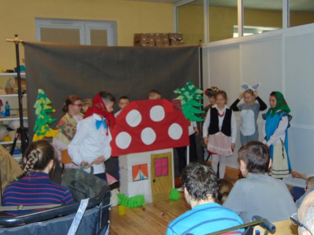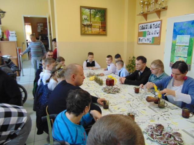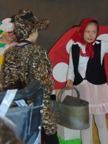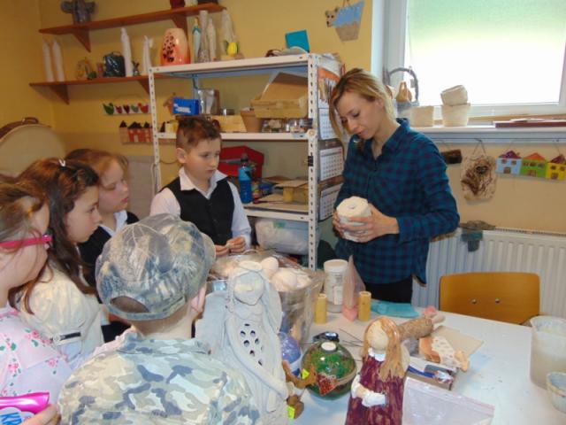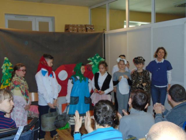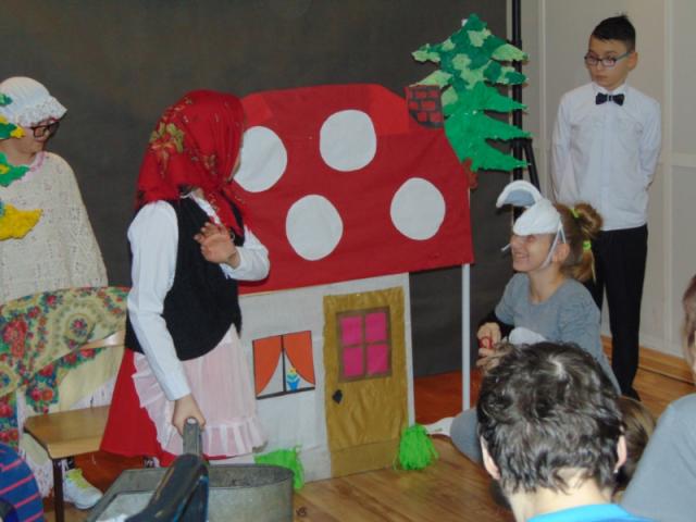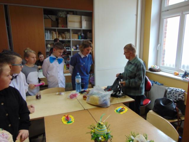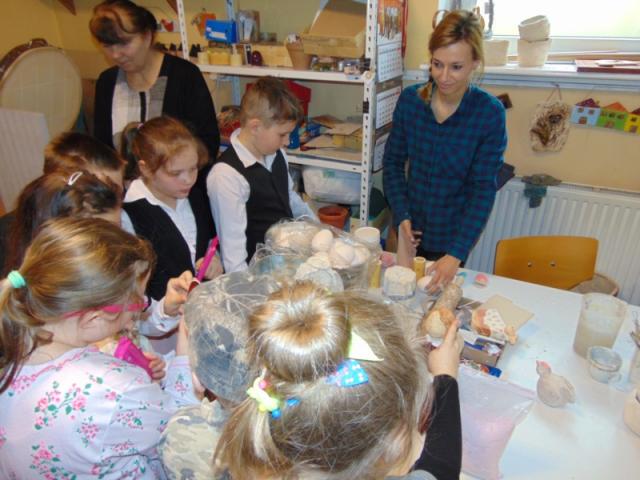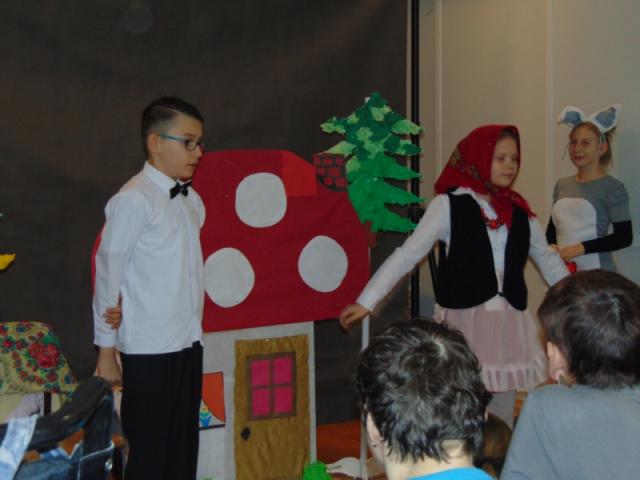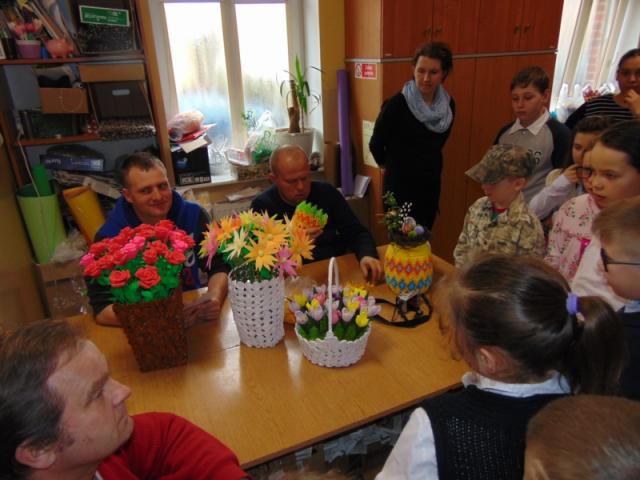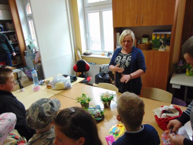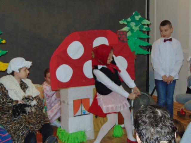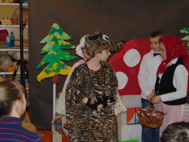 W gości nie przychodzi się zazwyczaj z pustymi rękoma, więc i my w formie podarunku zaprezentowaliśmy nowoczesną wersję doskonale znanej baśni - „Czerwonego Kapturka” - tym razem wg B. Butenki. Nie zabrakło w historii najistotniejszych dla rozwoju akcji bohaterów: wilka, babci i wyczekiwanej wnuczki, jednakże nie wszystko układało się w niej zgodnie z ustalonym scenariuszem. W ów feralny czwartek wilk po prostu zaspał w jakimś głębokim wykrocie i stąd cały ambaras. Nie dotarł na czas do chatki babci, Kapturek podejrzewał o niecne zamiary prawdziwą staruszkę, a leśniczy strzelał w próżnię. Dzięki komizmowi sytuacji było naprawdę zabawnie, czego starali się dowieść swą grą uczniowie. Prócz wrażeń scenicznych dzieci przygotowały dla wszystkich pięknie udekorowane muffinki oraz wielkanocne kartki, które wręczone zostały uczestnikom zajęć. Panie zaś bardzo chętnie zaprezentowały młodzieży pracownie specjalizujące się w ceramice, stolarce, wyrobach z filcu, produkcji biżuterii czy ozdób świątecznych. Dzieci z zapartym tchem śledziły kolejne etapy powstawania pięknych wytworów pracy podopiecznych warsztatów.
