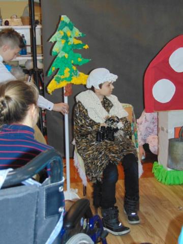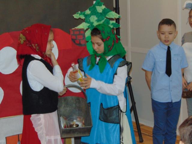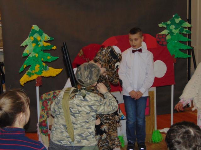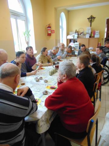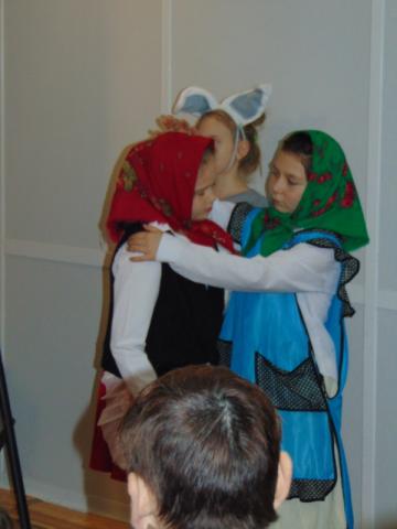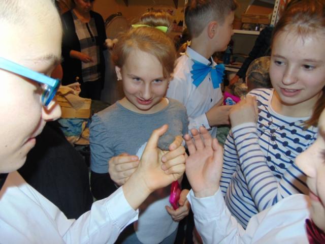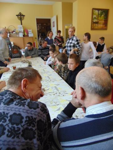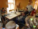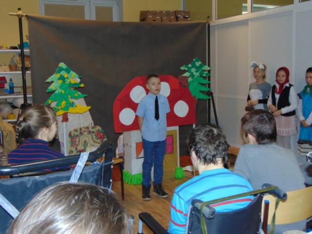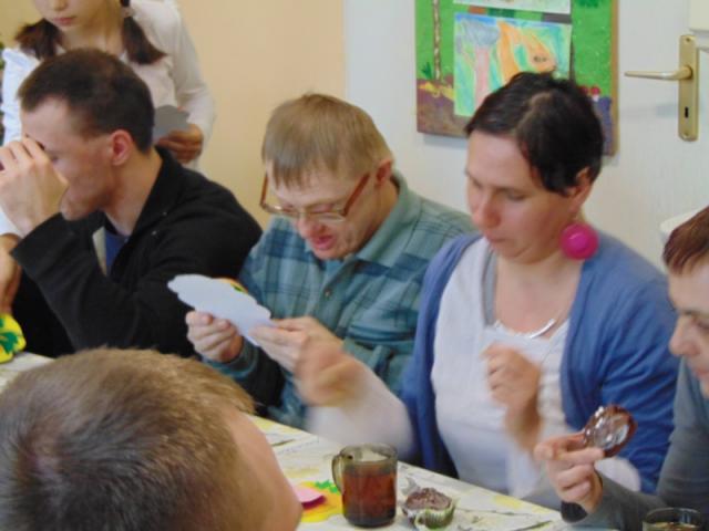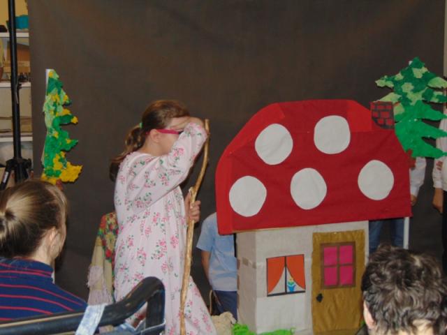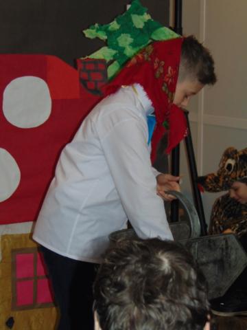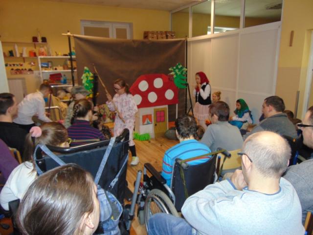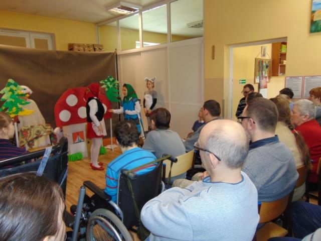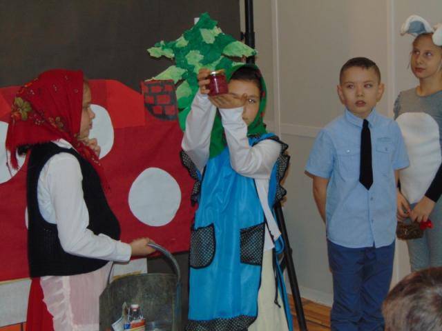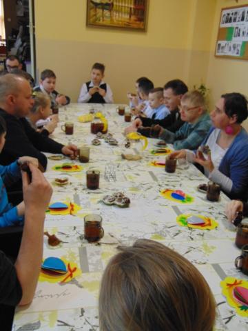 W gości nie przychodzi się zazwyczaj z pustymi rękoma, więc i my w formie podarunku zaprezentowaliśmy nowoczesną wersję doskonale znanej baśni - „Czerwonego Kapturka” - tym razem wg B. Butenki. Nie zabrakło w historii najistotniejszych dla rozwoju akcji bohaterów: wilka, babci i wyczekiwanej wnuczki, jednakże nie wszystko układało się w niej zgodnie z ustalonym scenariuszem. W ów feralny czwartek wilk po prostu zaspał w jakimś głębokim wykrocie i stąd cały ambaras. Nie dotarł na czas do chatki babci, Kapturek podejrzewał o niecne zamiary prawdziwą staruszkę, a leśniczy strzelał w próżnię. Dzięki komizmowi sytuacji było naprawdę zabawnie, czego starali się dowieść swą grą uczniowie. Prócz wrażeń scenicznych dzieci przygotowały dla wszystkich pięknie udekorowane muffinki oraz wielkanocne kartki, które wręczone zostały uczestnikom zajęć. Panie zaś bardzo chętnie zaprezentowały młodzieży pracownie specjalizujące się w ceramice, stolarce, wyrobach z filcu, produkcji biżuterii czy ozdób świątecznych. Dzieci z zapartym tchem śledziły kolejne etapy powstawania pięknych wytworów pracy podopiecznych warsztatów.